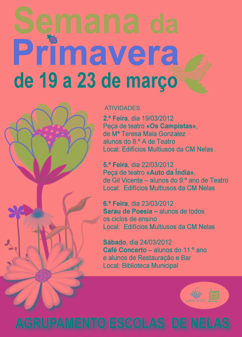 Como tem sido habitual, o AENelas uma vez mais se associa à CMNelas para pôr de pé a «Semana da Primavera». São três as ações que resultam totalmente da iniciativa de professores e alunos da Escola Secundária e uma que nasce da colaboração entre professores, alunos e pais do Agrupamento de Escolas de Nelas. Consulte o cartaz.